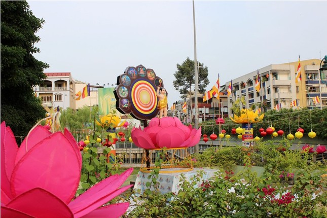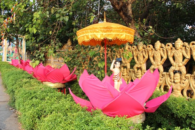 Vườn Lâm-tỳ-ni được thiết trí ngay trước cổng chùa với bảy đóa sen vàng đón mừng Phật Đản